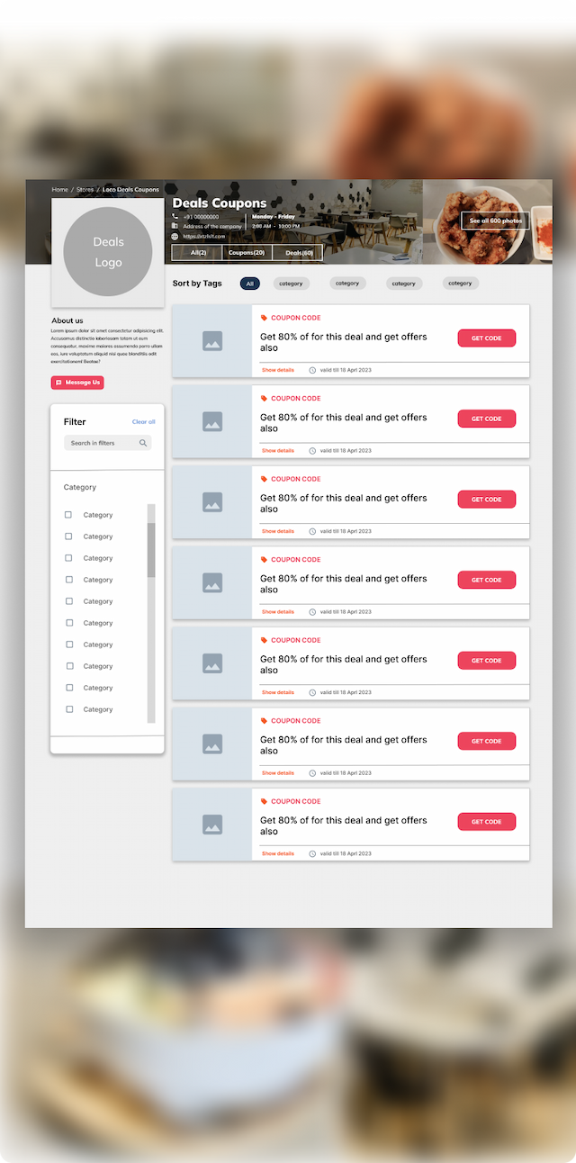 A visually appealing website design focused on providing users with the best food deals. The layout is optimized for easy navigation, allowing users to quickly find and claim offers at their favorite restaurants.