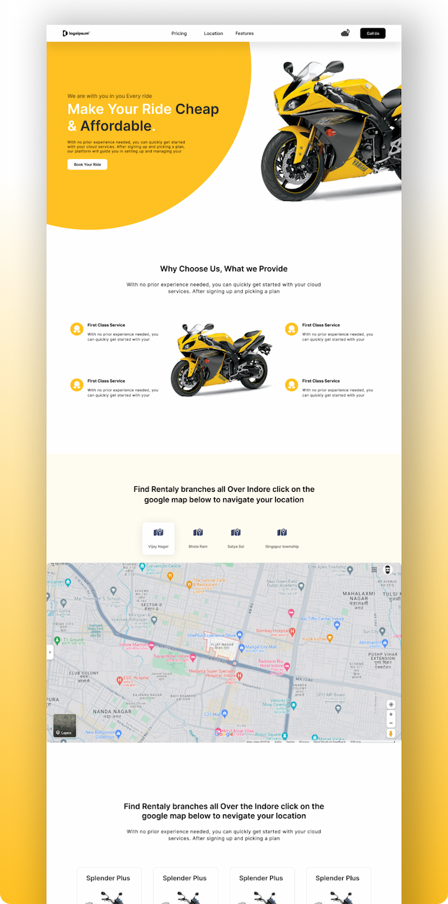 A user-friendly platform for renting bikes, offering a seamless booking process, location-based services, and detailed bike listings. The website is designed to make it easy for users to browse and rent bikes on the go.